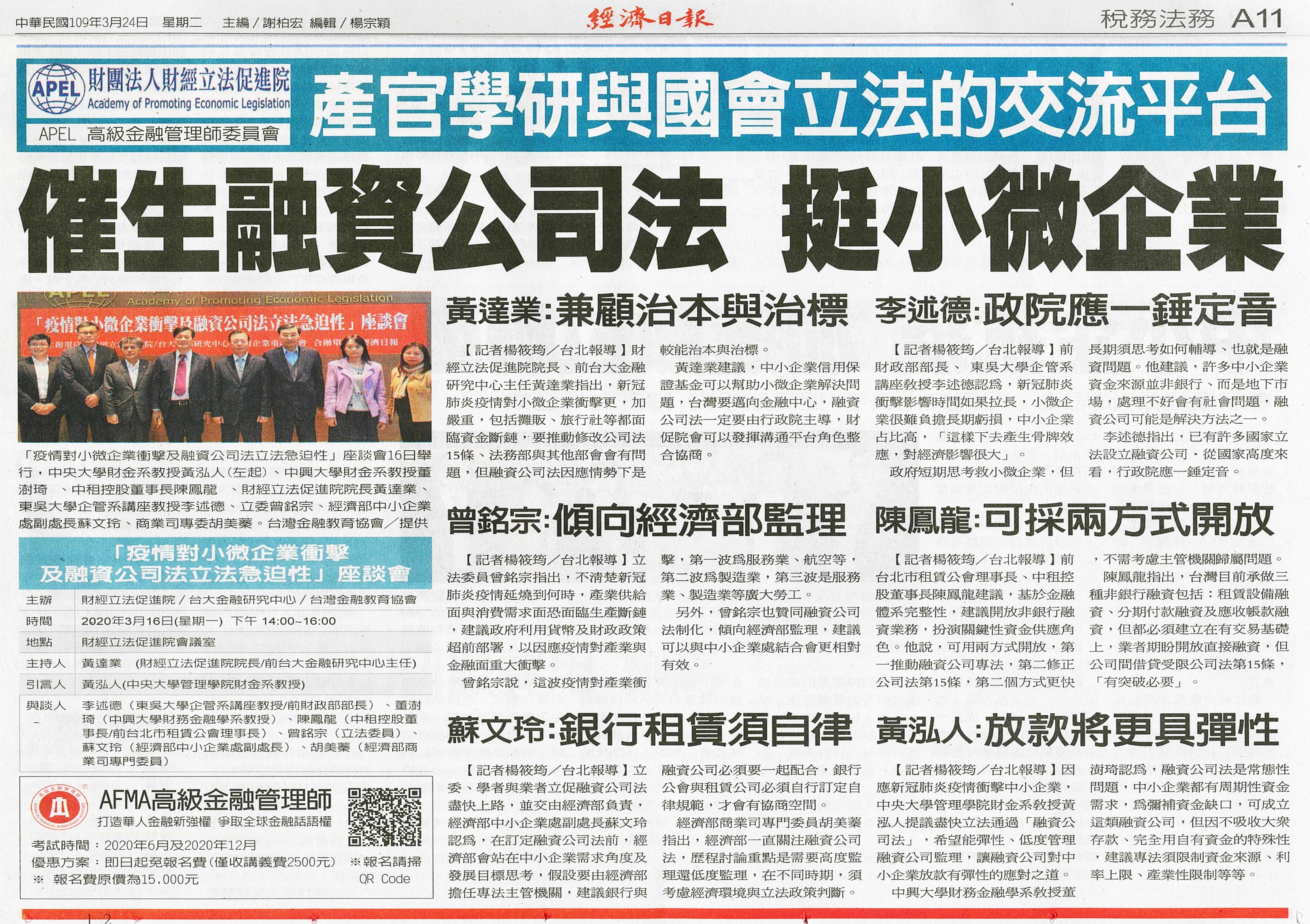 催生融資公司法 挺小微企業